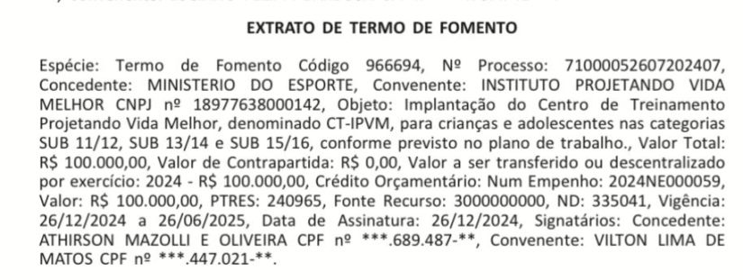 É com muita alegria que comunicamos a Vossa senhoria, que dia 26/12/2024 foi celebrado o Termo de Fomento, assinado entre INSTITUTO PROJETANDO VIDA MELHOR – 18.977.638/0001-42 e o Orgão 51000 – MINISTERIO DO ESPORTE. O Instrumento 966694, relativo à Proposta/Plano de Trabalho 22589/2024. O valor da Proposta mencionada é de R$ 100.000,00 e está vinculada à Emenda Individual 44970009, de autoria do parlamentar Prof. Paulo Fernando.