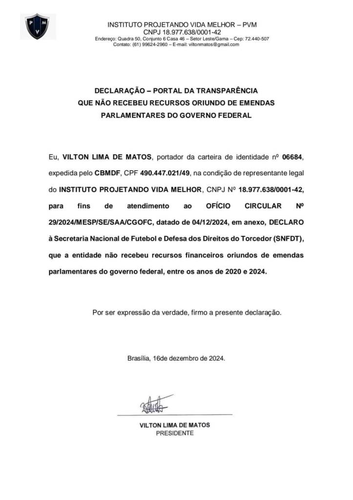 Atestamos junto ao Ministério do Esporte, que no período compreendido entre 2020 a 2024 o instituto Projetando Vida Melhor não recebeu verbas, oriundas de recursos públicos federais.